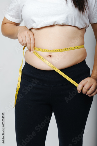 Asian woman hand holding belly fat behind baby belly, Overweight asian woman hand holding excess belly fat, Asian woman holding a tape measure waist excess fat around her waist