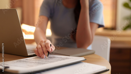 Asian woman hands are signing papers on desk with laptop. Adult female reviews business contract working from home office.