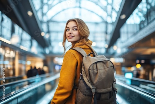 Asian woman in airport terminal escalator with backpack casual attire natural light modern travel lifestyle
