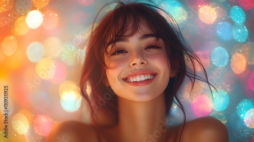 Asian woman smiles happily under bright festival lights at night, with a colorful bokeh background. Perfect for ads about happiness, cheerfulness, or festivals, conveying a warm, hopeful festive vibe.