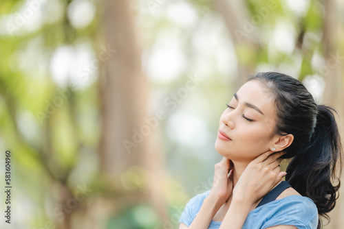 Asian woman stretching body and neck after jogging exercise at park in the city. Attractive athlete girl in sportswear enjoy outdoor lifestyle sport training fitness running workout in morning summer
