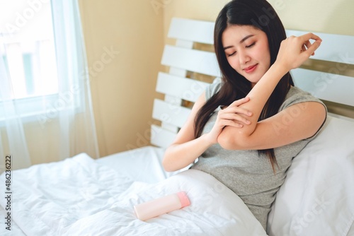asian woman use lotion hands cream moisture and white moisturize lotion on bed in bedroom, therapy beauty, skin care concept.