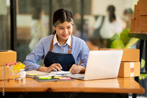 Asian women SME small business entrepreneurs online selling ideas Happy Young Asian business owner working on computers and boxes at home. Deliver SME parcel boxes to customers horizontally