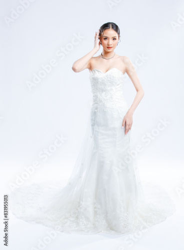 Asian young beautiful female portrait attractive model of bride wearing fashion wedding dress, luxury delight make-up, hairstyle, standing looking camera isolated white background studio indoor photo