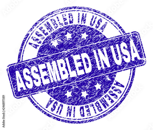 ASSEMBLED IN USA stamp seal watermark with distress style. Designed with rounded rectangle and circles. Blue vector rubber watermark of ASSEMBLED IN USA title with unclean style.