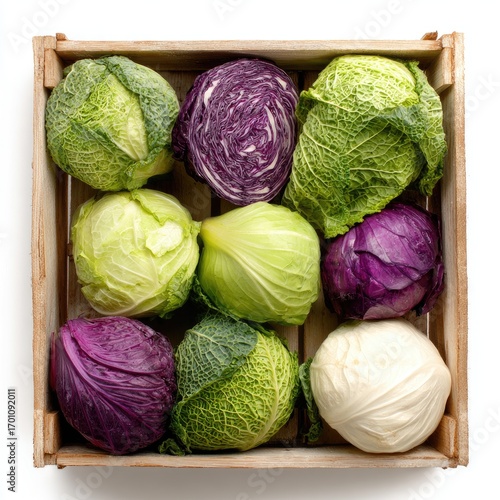 Assorted cabbages in a wooden crate