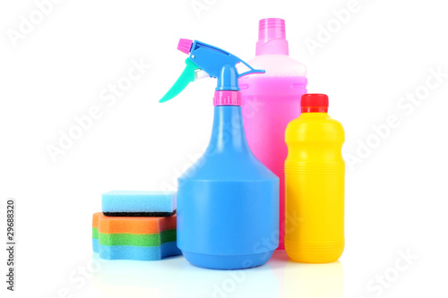 assorted cleaning products on white background