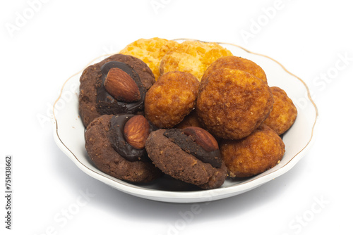 Assorted cookies of palm cheese and cornflakes and afghan cookies in a small white plate isolated on white background clipping path