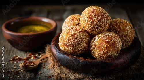 Assorted golden crispy sesame seed coated fried snacks served in a dark wooden bowl with dipping sauce on rustic wooden table