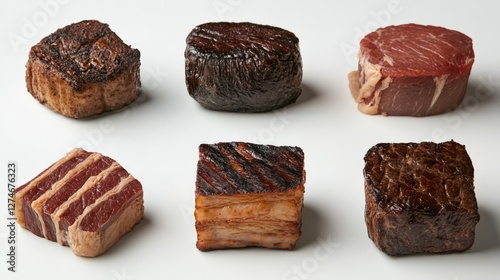 Assorted Grilled Meats Displayed on a White Background, Showcasing Different Cuts and Textures
