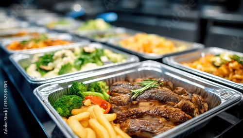 Assorted hot meals in aluminum trays, including steak, fries, vegetables, and stir-fried dishes, ready for catering or takeaway.