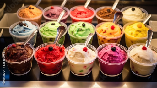 Assorted Ice Cream Cups with Toppings in Neon-Lit Display Case