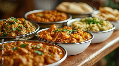 Assorted Indian curries in bowls on wooden table.