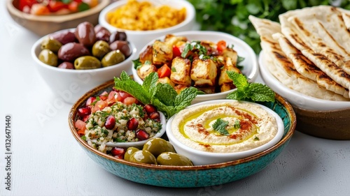 Assorted Mediterranean dishes with hummus, olives, tabbouleh, and pita bread on a white table.