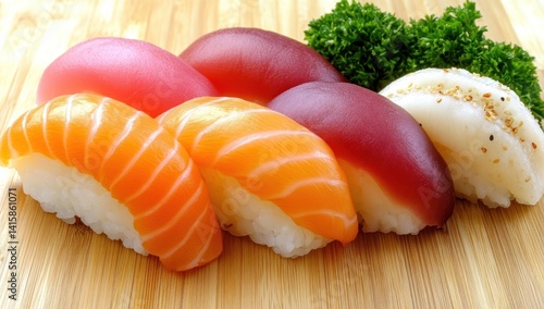 Assorted nigiri sushi pieces on a wooden board.