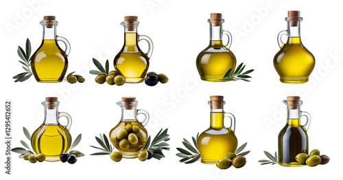 Assorted Olive Oil Bottles With Green Olives and Olive Leaves, isolated on transparent background
