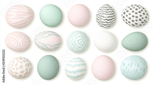 Assorted Patterned Easter Eggs with Varied Color Palettes Arranged on White Surface.