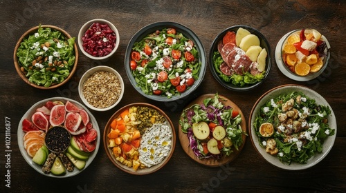 Assorted salads and healthy dishes arranged on a rustic wooden table, showcasing vibrant colors and fresh ingredients.