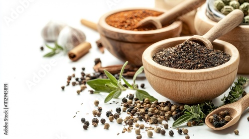 Assorted spices and herbs in wooden bowls on white background