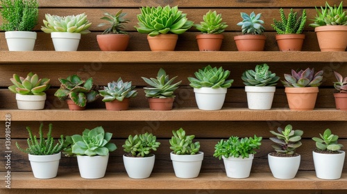 Assorted Succulent Plants in Various Pots on Wooden Shelves