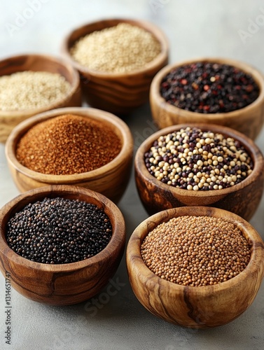 Assortment of Colorful Quinoa Grains in Rustic Wooden Bowls on Gray Surface Overhead Shot Healthy Food