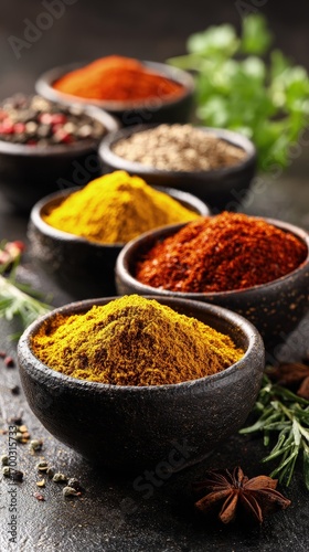 Assortment Of Colorful Spices In Bowls On Dark Background