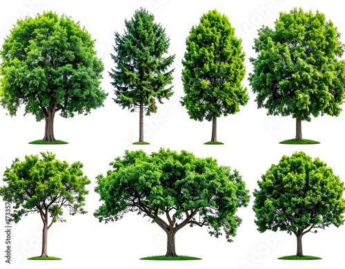 Assortment of diverse trees with leafy crowns, against a transparent background
