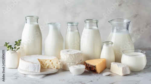 Assortment of fresh dairy products elegantly displayed on a marble-like surface, featuring various glass bottles filled with milk, including tall slender ones and a large jug brimming with milk. Cream