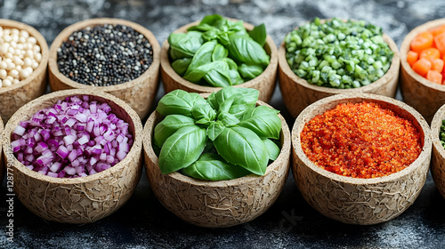 Assortment Of Fresh Food Ingredients In Wooden Bowls