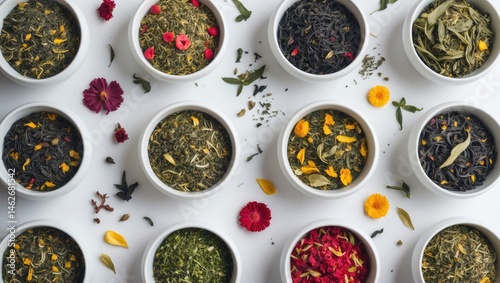 Assortment of loose dry tea leaves in bowls aligned in a row isolated on a white background, showcasing a panoramic banner with red, green, black, and herbal dried fruit ingredients for herbal tea