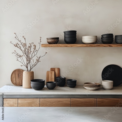 Assortment of rustic kitchenware displayed beautifully on wooden shelf