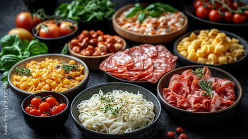 Assortment of traditional Italian dishes including pasta, pizza, and risotto, served in a bright, inviting atmosphere. A celebration of Italian culinary heritage and flavors.