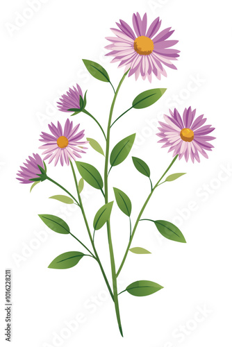 Aster Branch With Flowers Vector Illustration On White Background