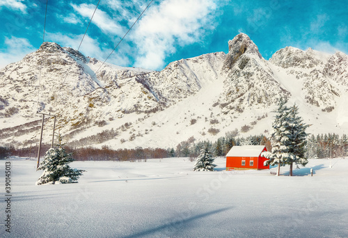 Astonishing winter scenery with traditional Norwegian wooden houses and pine trees near Valberg village at Lofotens.