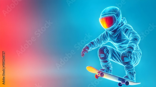 Astronaut skateboarding; futuristic action, neon background, space exploration concept; ideal for sci-fi, technology, sports websites.