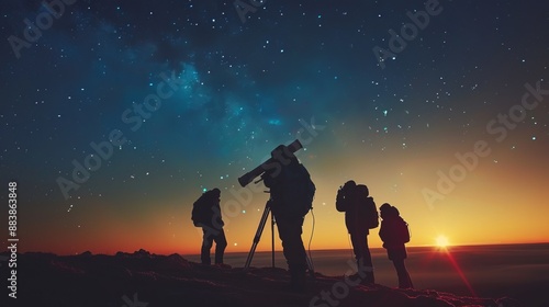 Astronomers observing stars through a powerful telescope under a clear night sky