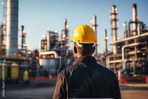 At back of the Workers engineer in Oil and gas industrial, Oil refinery plant from industry, Refinery Oil storage tank and pipe line steel.