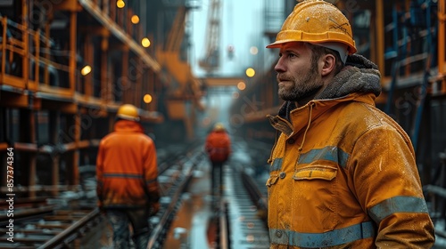 At construction site, reflecting the work activity, machinery, and characteristic elements of the environment, such as cranes, scaffolding, workers with hard hats and vests. Generative AI.