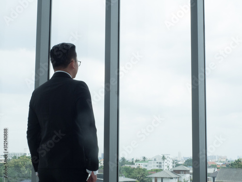 At the office ceo the company the young man business stand outside the window thinking creativity idea management about the plans and vision that would lead the organization to success with strategy.