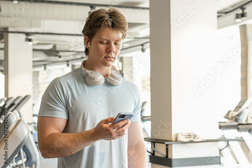 Athlete man with mobile phone standing at gym. Warming up. Preparation for cardio training. Trainer waiting for client. Close up.