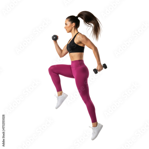 Athletic woman dynamically performing a step aerobics exercise with dumbbells on transparent field