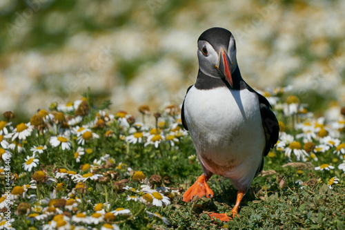 Atlantic puffin (Fratercula arctica) amongst summer flowers on Skomer Island off the coast of Pembrokeshire in Wales, United Kingdom