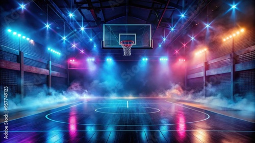 Atmospheric basketball court with neon lights, smoke, and futuristic arena design, neon lights