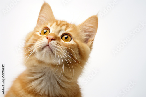 Attentive Yellow Cat looking up close-up portrait on a white background.