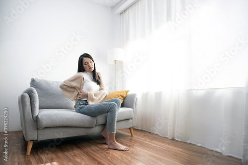 Attractive Asian young woman suffering from stomach ache, gastritis, menstruation, colitis, concept of female stomach ache.