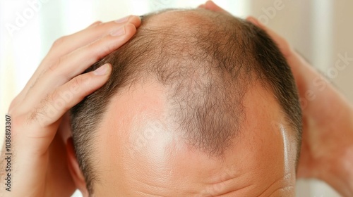 Attractive Caucasian male adult in his 30s concerned about baldness looks into the mirror to examine his premature receding hairline.