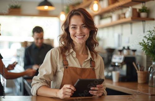 Attractive woman cafe owner smiles behind shop counter with tablet. Barista taking order. Modern coffee shop. Young business owner in apron. Successful small business. Cafeteria service.