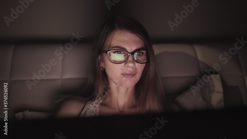 Attractive young businesswoman working at night via computer at office with, closeup of hipster student girl browsing the internet, looking at monitor of modern computer, focus on the glasses