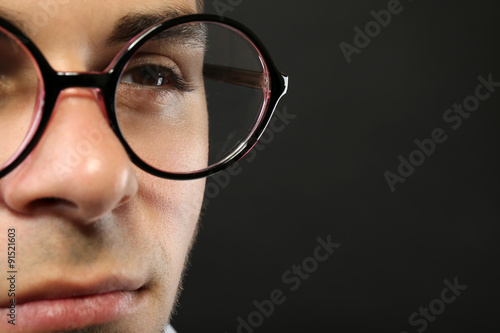 Attractive young man with glasses on gray background