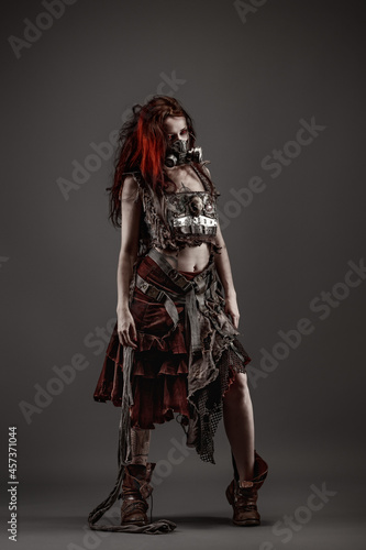 Attractive young woman with red eyes wearing post apocalyptic clothing and a gas mask